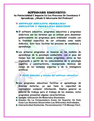 Este documento trata sobre el software educativo y su potencial impacto en los procesos de enseñanza y aprendizaje. Explica que el software educativo incluye programas creados para ser usados como medios didácticos y facilitar el aprendizaje. Luego describe algunas características de este tipo de software como su capacidad de representar información de manera interactiva y personalizada. Finalmente, discute que el impacto del software educativo depende de cómo es utilizado por el profesor.