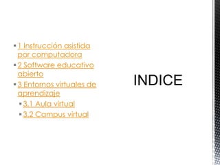 El documento describe tres tipos de software educativo: 1) instrucción asistida por computadora, que presenta lecciones de forma secuencial; 2) software educativo abierto, que proporciona entornos de exploración y construcción; y 3) entornos virtuales de aprendizaje, que incluyen aulas virtuales para actividades de enseñanza y aprendizaje simuladas y campus virtuales que ofrecen formación a través de Internet. Cada enfoque tiene ventajas y desventajas dependiendo de si se centra más en la enseñanza o en el