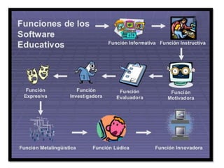 El documento define el software educativo como aquel destinado a la enseñanza y el aprendizaje autónomo que permite el desarrollo de habilidades cognitivas. Describe los entornos virtuales de aprendizaje, incluyendo las aulas virtuales que permiten actividades de enseñanza y aprendizaje a través de una plataforma en línea, y los campus virtuales que ofrecen formación a través de Internet. También discute el software educativo abierto que enfatiza el aprendizaje creativo sobre la enseñanza y permite a los estud