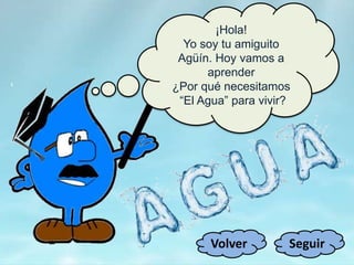 Este documento presenta información sobre el agua y su importancia para la vida. Explica que el agua existe en tres estados (líquido, sólido y gaseoso) y describe el ciclo del agua. También cubre cómo el ser humano contamina el agua y por qué es una sustancia fundamental para todos los seres vivos. El documento incluye actividades interactivas sobre estos temas.