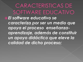 El software educativo se utiliza para mejorar el proceso de enseñanza-aprendizaje al apoyar tanto a docentes como alumnos. Este tipo de software motiva a los estudiantes y hace que las clases sean más dinámicas e interesantes, mejorando así la calidad de la educación. Se recomienda que tanto maestros como alumnos hagan un mayor uso de este tipo de herramientas educativas para obtener mayores beneficios en el aprendizaje.