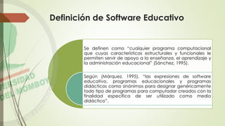 El documento define el software educativo y sus características. Explica que es cualquier programa que apoya la enseñanza y el aprendizaje. Describe que debe contener elementos metodológicos, ser fácil de usar, motivar a los estudiantes y ofrecer retroalimentación. También resume las teorías del aprendizaje, componentes, tipos y clasificaciones de programas educativos. Finaliza explicando las funciones del software como instruir, informar, motivar y evaluar a los estudiantes.