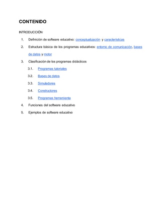 Este documento define el software educativo y describe sus características y clasificaciones. Explica que el software educativo utiliza el ordenador como medio para facilitar el aprendizaje de manera interactiva e individualizada. Se clasifican los programas en tutoriales, bases de datos, simuladores, constructores y herramientas, dependiendo de su estructura y funcionalidad. Además, analiza los componentes comunes de los programas educativos como la interfaz, bases de datos y algoritmos.