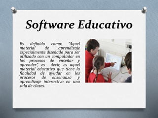 Este documento presenta información sobre software educativo. Define software educativo como material de aprendizaje diseñado para ser usado con computadoras en procesos de enseñanza y aprendizaje. Describe varios tipos de software educativo incluyendo ejercitación, simulación, material de referencia multimedia, historias y cuentos e hiperhistorias. También detalla atributos como constructividad, navegabilidad, interactividad y criterios pedagógicos como pertinencia, orientaciones metodológicas y usabilidad.