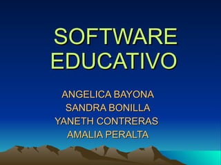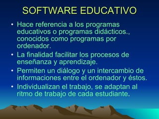 El documento habla sobre el software educativo. Explica que es un programa didáctico que facilita los procesos de enseñanza y aprendizaje a través de la interacción entre el ordenador y el estudiante. Describe dos tipos principales: la instrucción asistida por computadora y el software educativo abierto. Da como ejemplos de este último tipo Logo, Etoys, Scratch y GeoGebra.