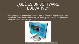 El documento describe el software educativo, programas creados para facilitar los procesos de enseñanza-aprendizaje. Explica que son interactivos y se adaptan al ritmo de cada estudiante. Además, clasifica los diferentes tipos de software educativo como prácticas, tutoriales, simulaciones y juegos instructivos. Finalmente, discute algunas ventajas como favorecer diferentes tipos de aprendizaje, y desventajas como falta de control de calidad de contenido.