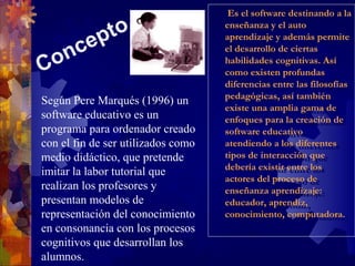 El documento define el software educativo como programas creados para ser usados como medios didácticos que imitan el trabajo tutorial de los profesores. Existen diferentes enfoques para crear software educativo que consideran las interacciones entre educadores, estudiantes, conocimiento y computadoras. El software educativo permite la interactividad, representaciones animadas y desarrollar habilidades a través de la práctica, a la vez que facilita transmitir grandes cantidades de información.