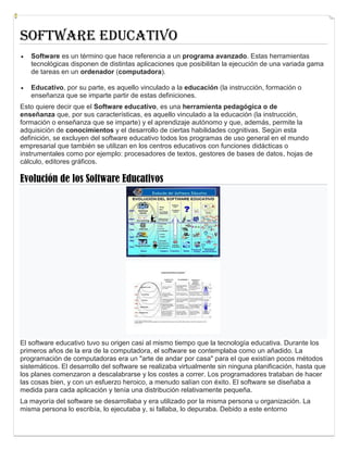 El documento describe el software educativo, su evolución y funciones. Explica que el software educativo son herramientas pedagógicas que permiten la adquisición de conocimientos y habilidades de forma autónoma. Su origen se remonta a los primeros años de la computadora cuando se usaba de forma complementaria a la enseñanza. Desde entonces ha evolucionado, pasando de ser diseñado a medida a convertirse en productos comerciales. El software educativo cumple funciones informativas, instructivas, motivadoras, evaluadoras e investigadoras y