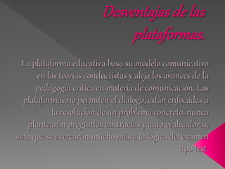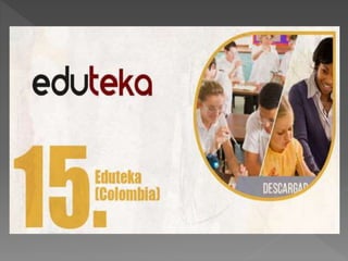 Este documento lista varias plataformas educativas virtuales populares como Moodle, edu20, Eduteka, y Twiducate que permiten a los educadores crear cursos en línea y compartir recursos educativos.