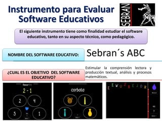 El software educativo Sebran ABC tiene como objetivo estimular la comprensión lectora, producción textual y procesos matemáticos en niños de 4 a 7 años. Incluye actividades como suma, resta, multiplicación, selección de imágenes y juegos de memoria. Es de tipo individual, con facilidad de uso e instalación, y genera ambientes interactivos que motivan el aprendizaje, aunque carece de sistemas de evaluación y su diseño visual no es muy atractivo.