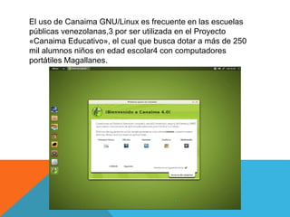 El documento describe Canaima GNU/Linux, una distribución de Linux venezolana basada en Debian. Fue creada como consecuencia de un decreto presidencial que promueve el uso de tecnologías libres en el gobierno. Canaima incluye aplicaciones de ofimática, internet, gráficos y programación. Es utilizada comúnmente en escuelas públicas a través del Proyecto Canaima Educativo, el cual provee computadoras portátiles a estudiantes.