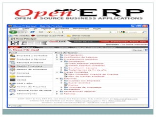 El documento proporciona información sobre diferentes sistemas ERP propietarios y de código abierto. Brevemente describe a Microsoft Dynamics NAV y SAP como opciones ERP propietarias integrales. También presenta a WebERP y Open ERP como alternativas de código abierto flexibles que pueden adaptarse a diferentes negocios de manera escalable.