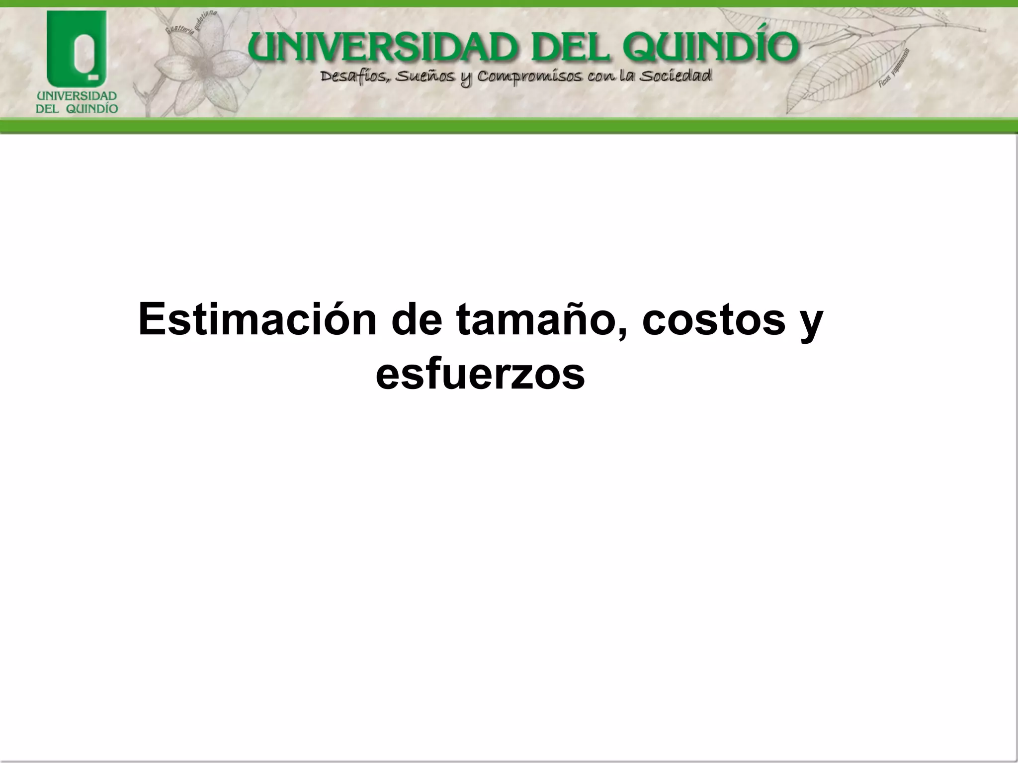 1. El documento presenta diferentes métodos para estimar el tamaño, costos y esfuerzos de proyectos de desarrollo de software, incluyendo el método Delphide Banda Ancha, el modelo COCOMO y el método de Puntos de Función.