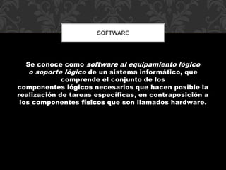 El documento define varios tipos de software, incluyendo software de sistema que aísla al usuario de los detalles internos del hardware, software de programación que permite a los programadores desarrollar programas usando diferentes lenguajes, y software de aplicación que permite a los usuarios realizar tareas específicas en diferentes campos. También describe conceptos como aplicaciones portables que pueden usarse en diferentes sistemas operativos sin instalación, archivadores de ficheros que combinan archivos para almacenamiento más fácil, e instalación y sistemas de gestión de pa