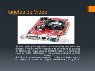 Este documento describe las características básicas de las tarjetas de video y de audio. Explica que las tarjetas de video procesan gráficos para liberar al procesador central, mientras que las tarjetas de audio procesan señales de audio. También detalla los componentes clave de cada tarjeta como la GPU, memoria y ventilador en las tarjetas de video y el DSP y puertos en las tarjetas de audio.