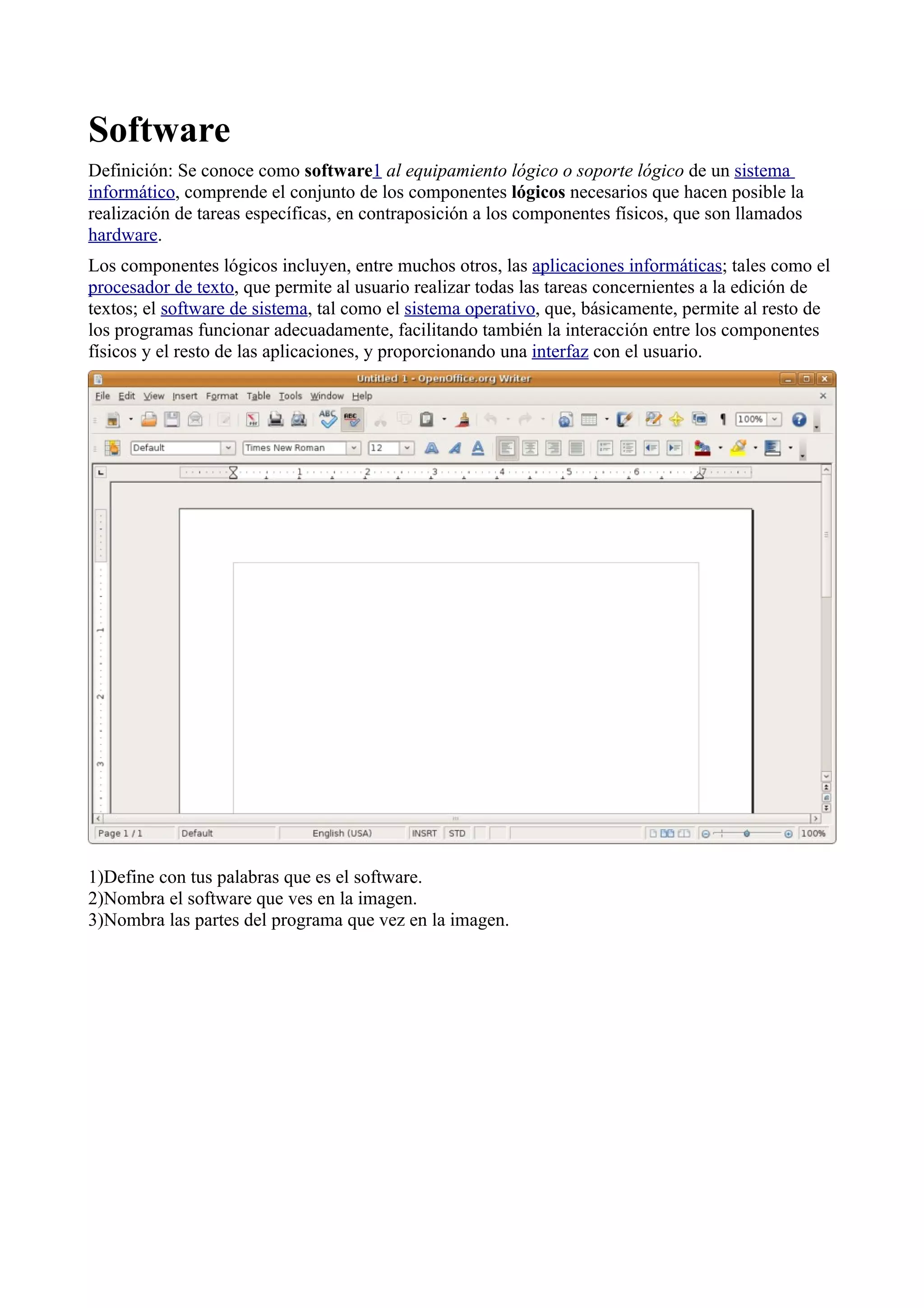 El documento define el software como el conjunto de componentes lógicos necesarios para que un sistema informático realice tareas específicas, a diferencia del hardware que son los componentes físicos. Menciona que el software incluye aplicaciones como procesadores de texto y sistemas operativos, que permiten que otros programas funcionen y facilitan la interacción entre hardware y aplicaciones.