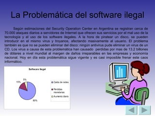 El documento discute los problemas de seguridad y económicos asociados con el uso de software ilegal, incluyendo virus, falta de soporte técnico y pérdidas económicas de billones de dólares. También describe las ventajas del software legal como la creación de empleos, el cumplimiento de la ley y un mejor rendimiento técnico. Se concluye que el software legal ofrece mayor seguridad y soluciones a problemas, mientras que el software ilegal expone a los usuarios a virus.