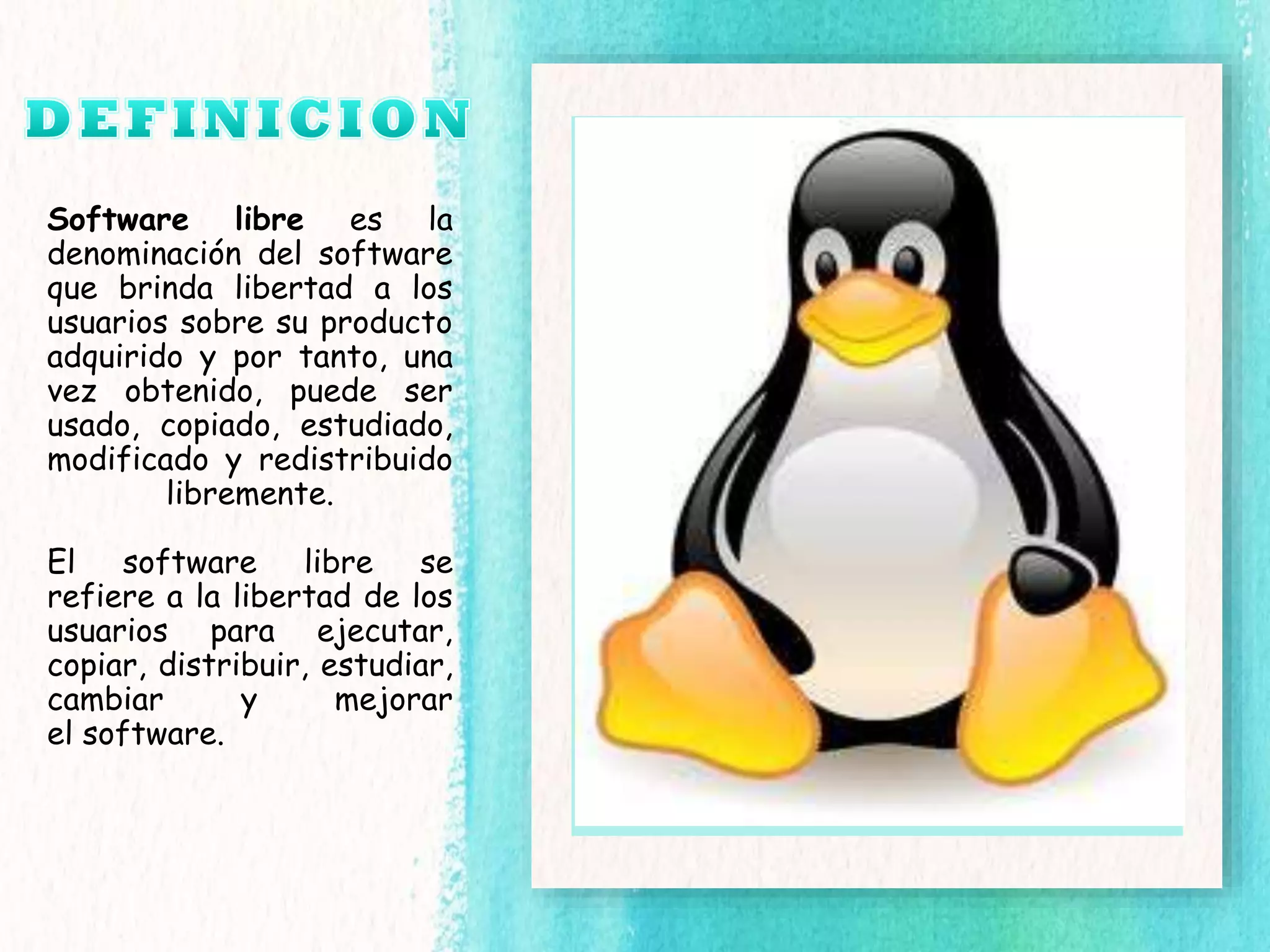 El documento define el software libre como aquel que brinda libertad a los usuarios para usar, copiar, estudiar, modificar y redistribuir el software libremente una vez adquirido. El software libre también se refiere a la libertad de los usuarios para ejecutar, copiar, distribuir, estudiar, cambiar y mejorar el software. El documento enumera cuatro libertades clave del software libre: la libertad de usar el programa con cualquier propósito, estudiar su funcionamiento y adaptarlo a las necesidades, distribuir copias para ayudar a otros, y mejorar
