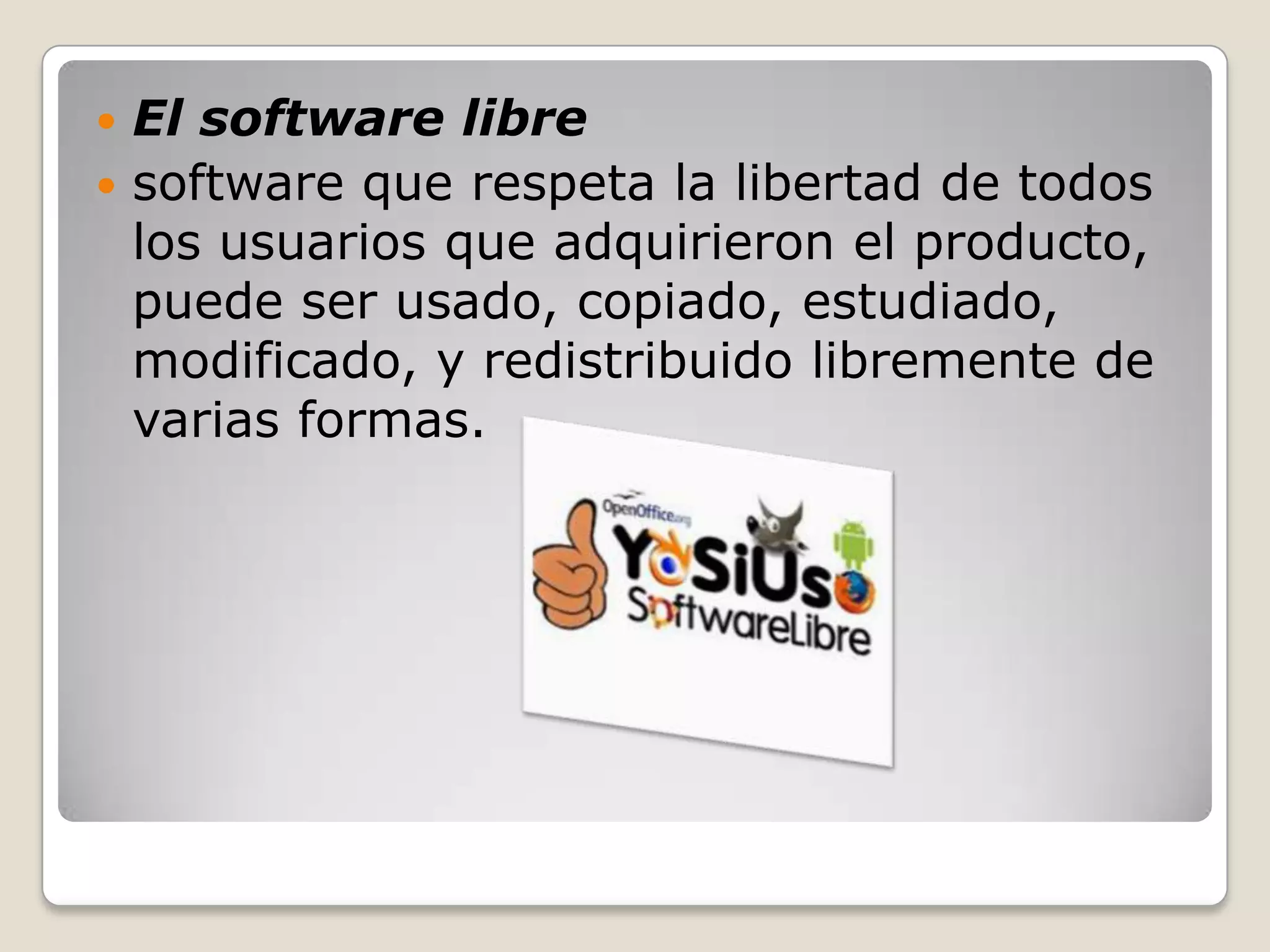 El documento habla sobre el software libre y varios programas libres populares. Define el software libre como aquel que respeta la libertad de los usuarios de usar, estudiar, modificar y redistribuir el software. Luego describe programas libres populares como VLC media player, Cinelerra, Total Video Converter, Blender, Firefox, Nautilus, PCSX2 y Maxima.