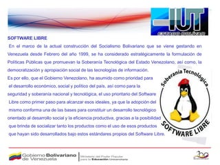 Este documento presenta las políticas del gobierno venezolano para promover el uso y desarrollo de software libre. Define software libre como programas que garantizan acceso al código fuente, permiten ejecutar, modificar y redistribuir el software. Describe las ventajas del software libre como independencia tecnológica, control de información y confiabilidad. Finalmente, explica las cuatro libertades básicas del software libre: usar, estudiar, distribuir y mejorar el software.