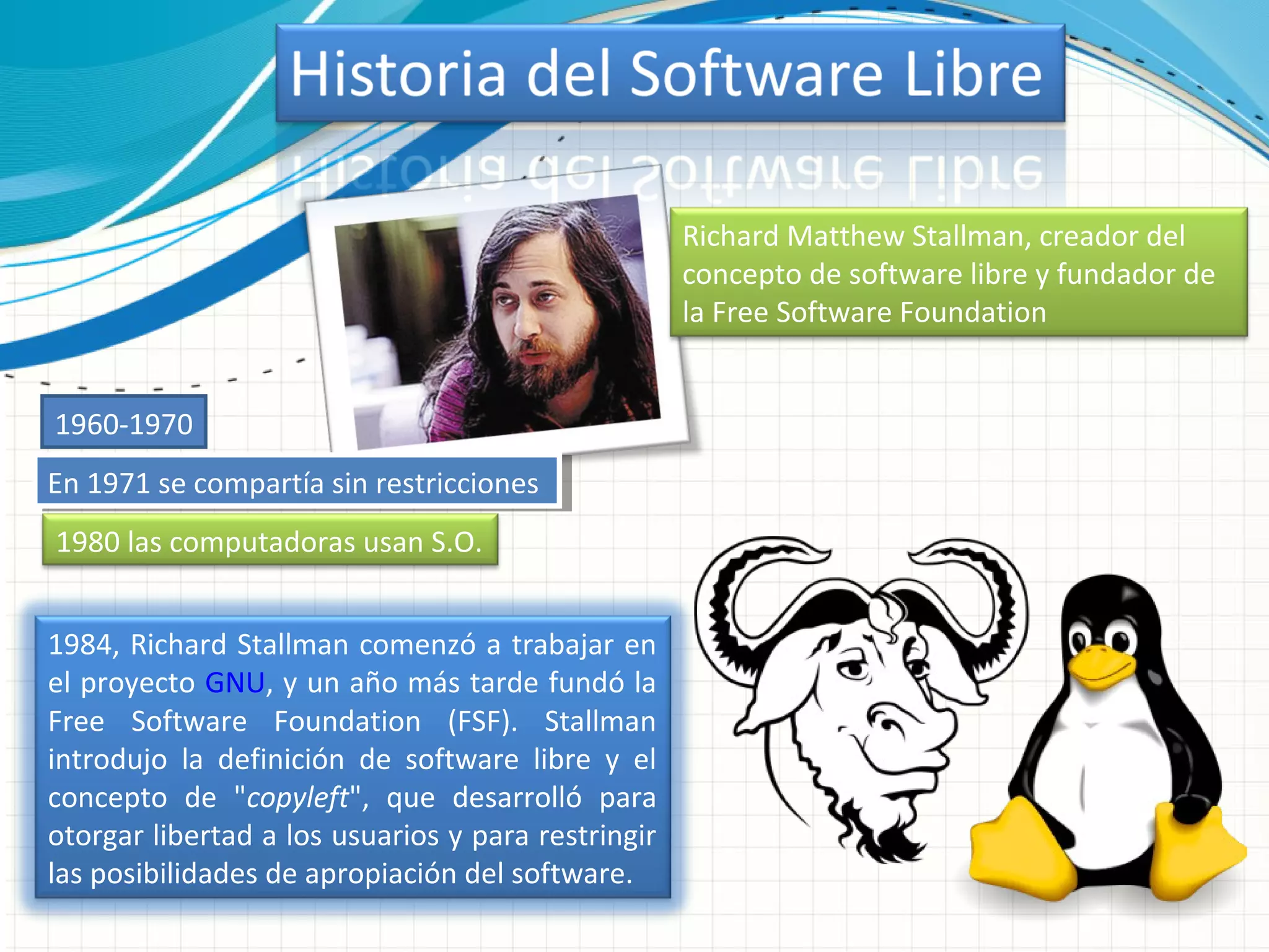 Este documento trata sobre el software libre y su historia. Explica que en 1984 Richard Stallman comenzó el proyecto GNU para crear un sistema operativo libre y fundó la Free Software Foundation. Define software libre como aquel que respeta la libertad de los usuarios a copiar, distribuir, estudiar y modificar el código. También discute las ventajas del software libre como su bajo costo y fomento de la innovación.