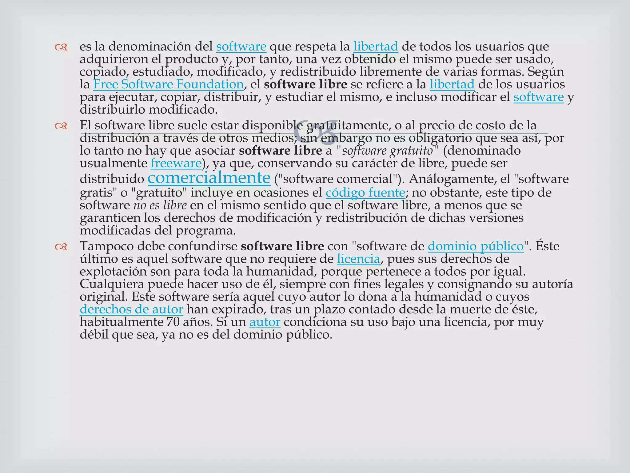 El documento define el software libre como software que respeta la libertad de los usuarios para ejecutar, copiar, distribuir, estudiar y modificar el software, y redistribuir versiones modificadas. Explica que el software libre puede distribuirse gratuitamente o comercialmente, y no debe confundirse con software gratuito o de dominio público, que no garantizan necesariamente los mismos derechos de los usuarios.