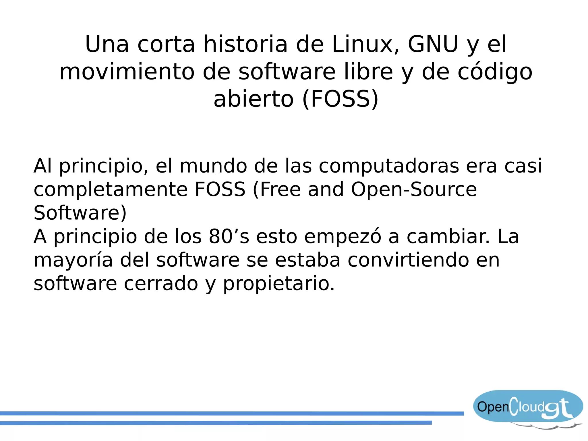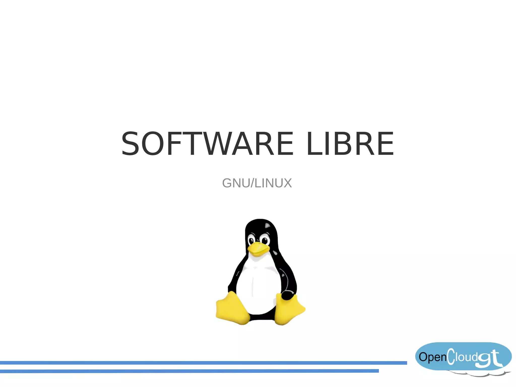 El documento resume la historia del software libre y del sistema operativo GNU/Linux. Explica que en los años 80 la mayoría del software se convirtió en propietario, pero que en los 90 el proyecto GNU había creado la mayoría de las piezas necesarias para un sistema operativo excepto el núcleo. En 1991, Linus Torvalds creó el núcleo Linux, y al combinarlo con el trabajo de GNU se completó el sistema operativo GNU/Linux. Luego describe las ventajas del software libre y de distribuciones populares de Linux como Ubuntu, incluyendo