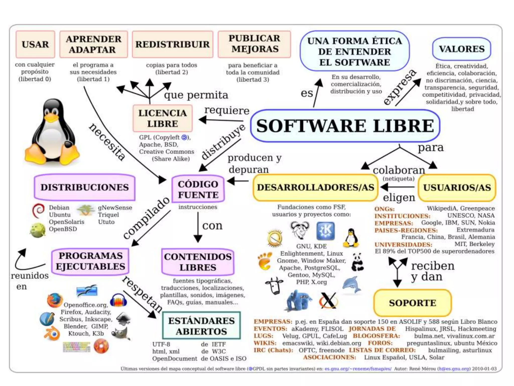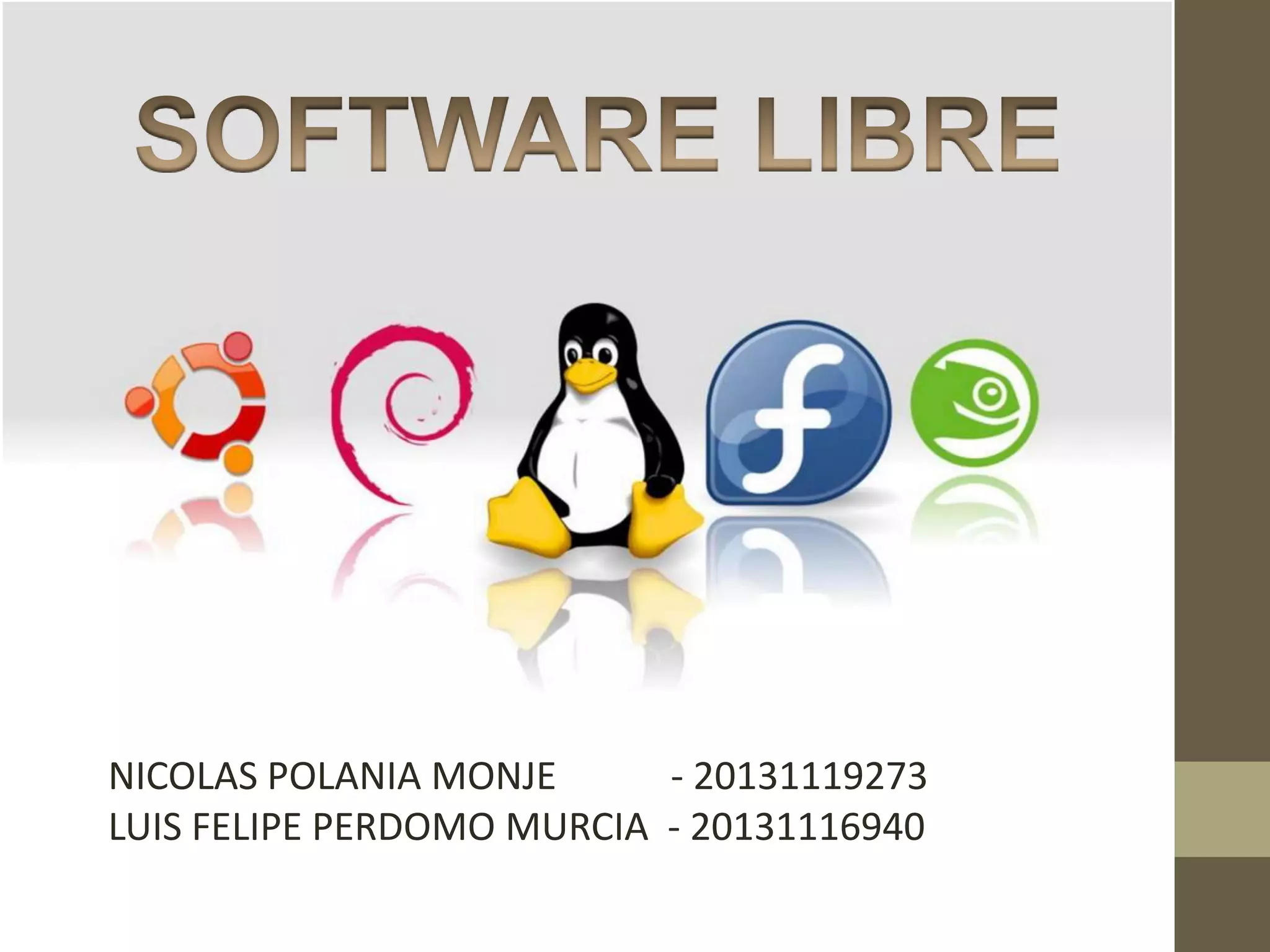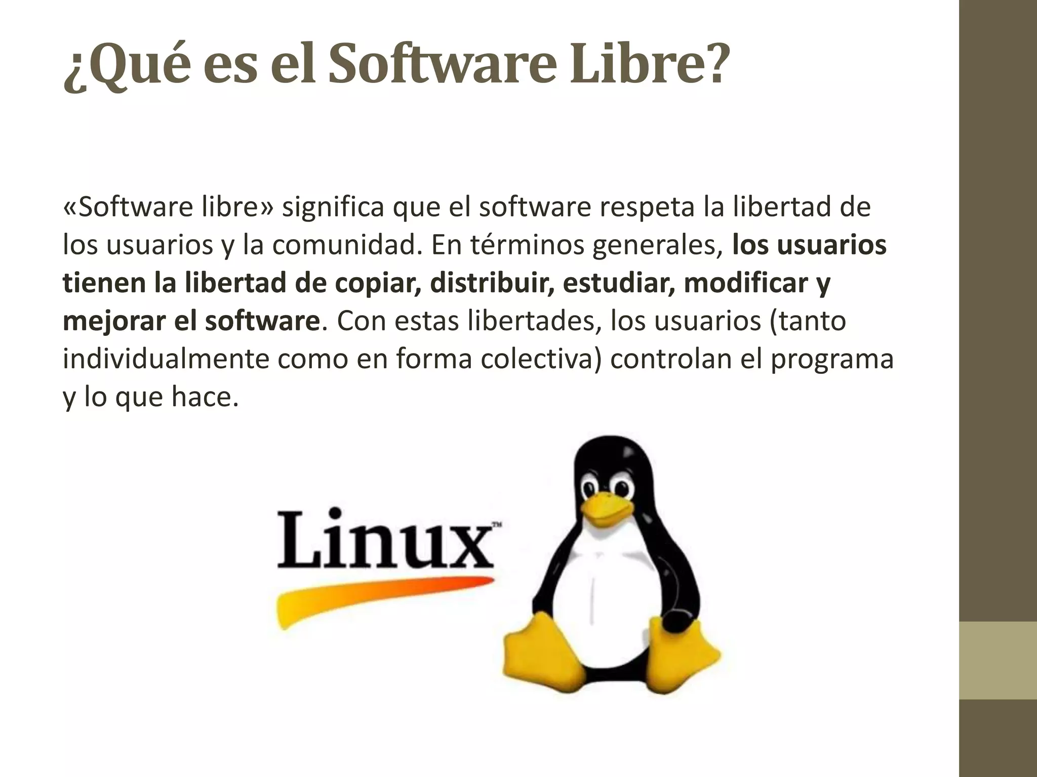 El documento define el software libre como software que respeta la libertad de los usuarios de copiar, distribuir, estudiar, modificar y mejorar el software. Específicamente, el software libre se refiere a los cuatro tipos de libertades para los usuarios: 0) usar el programa con cualquier propósito, 1) estudiar y modificar el programa, 2) distribuir copias del programa, y 3) mejorar y compartir mejoras del programa con la comunidad. Algunos ejemplos prominentes de software libre incluyen GNU/Linux, el núcleo Linux, el navegador