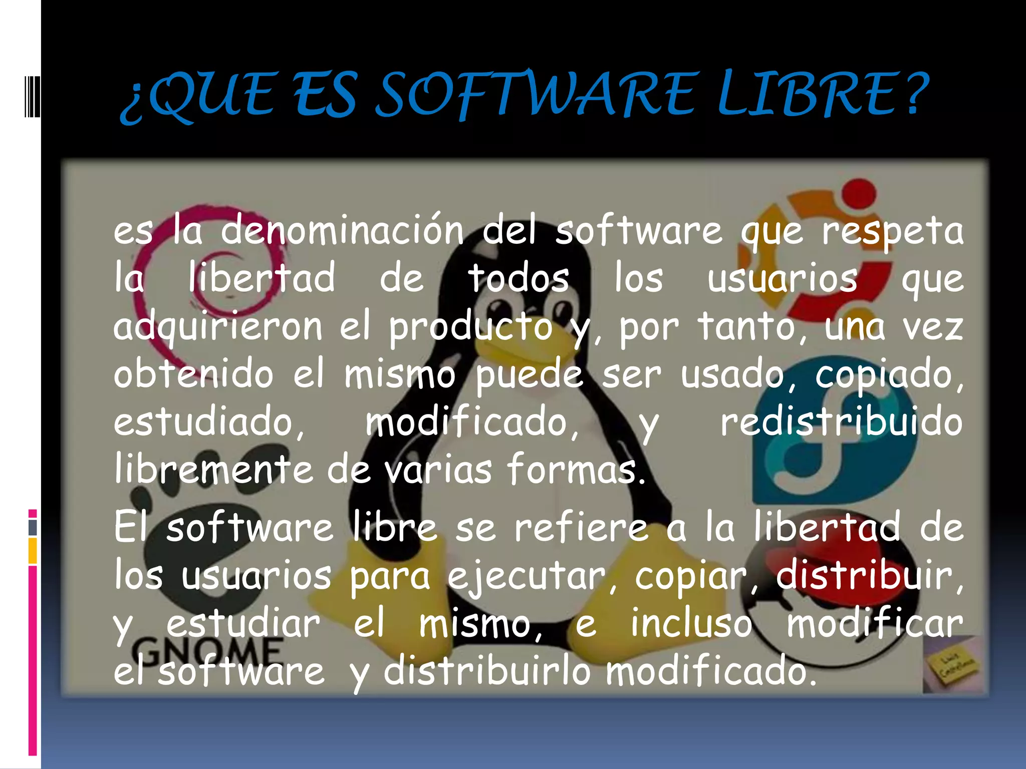 Este documento define el software libre como software que puede ser usado, copiado, estudiado, modificado y redistribuido libremente por los usuarios. Explica que el software libre garantiza cuatro libertades a los usuarios: la libertad de usar el software para cualquier propósito, estudiar y modificar el código, distribuir copias del software, y mejorar el software y compartir esas mejoras. Concluye que el software libre permite a las personas manejar el software según sus necesidades sin costo y compartirlo para actividades educativas y empresariales.