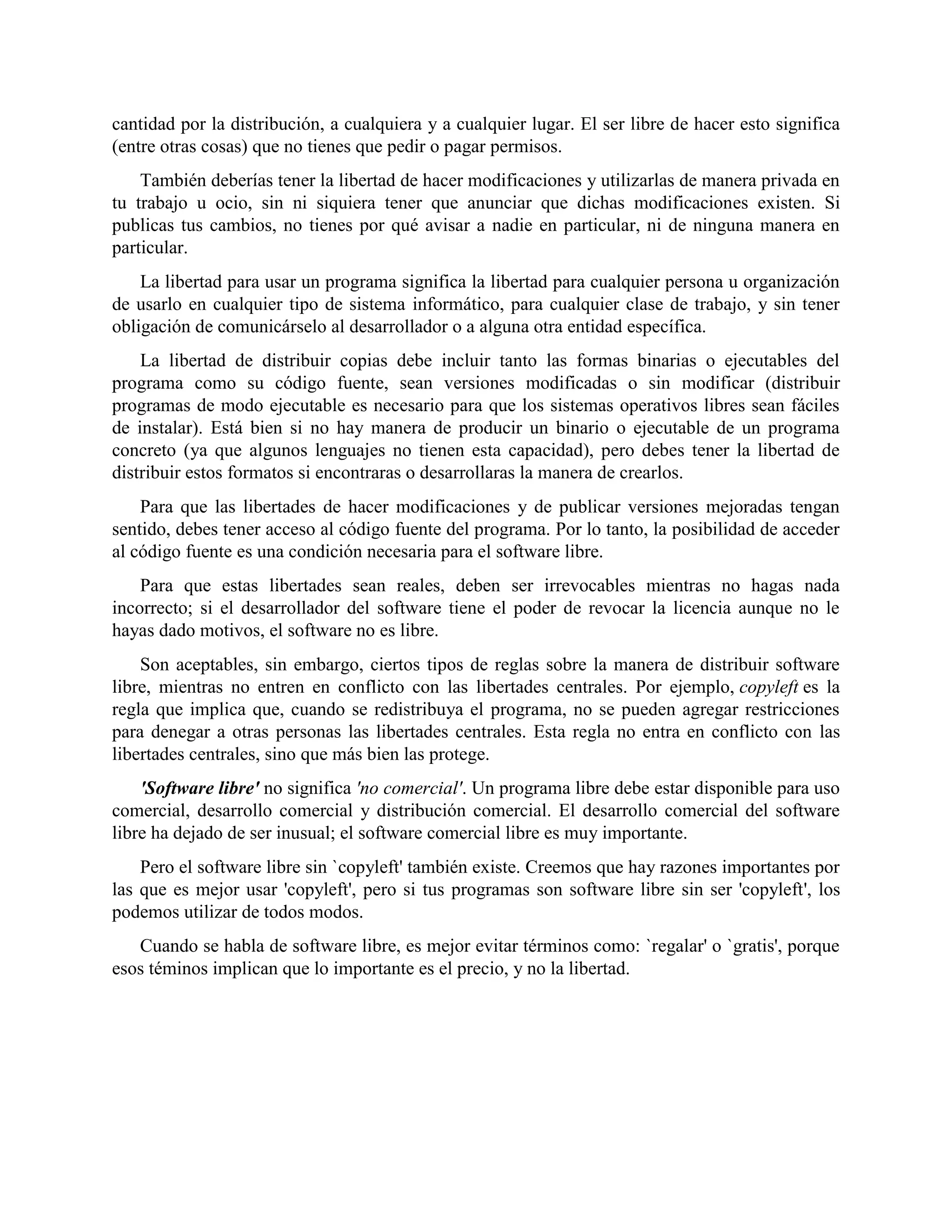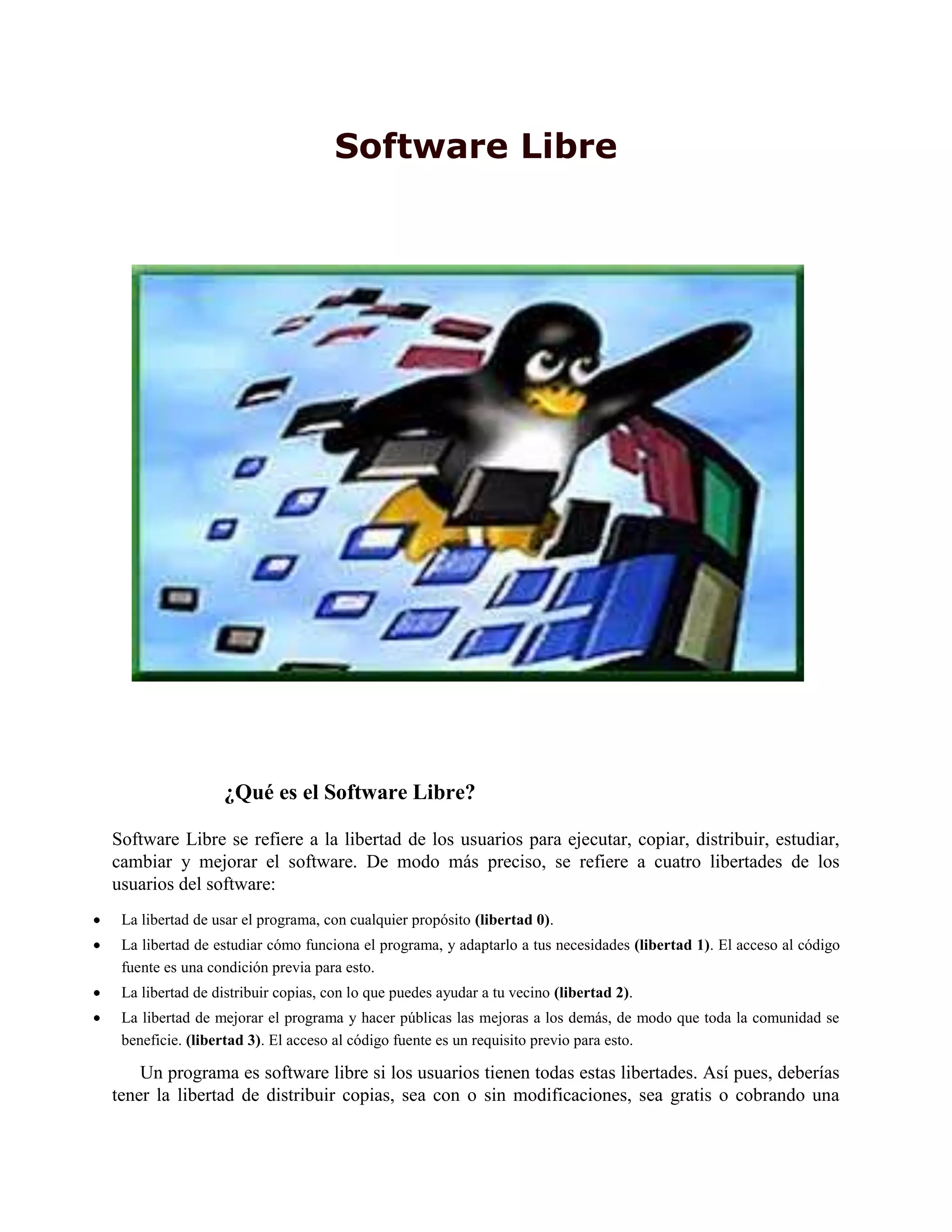 Este documento define el software libre como aquel que le da a los usuarios la libertad de ejecutar, copiar, distribuir, estudiar, cambiar y mejorar el software. Específicamente, el software libre otorga cuatro libertades a los usuarios: la libertad de usar el programa con cualquier propósito, acceder al código fuente, distribuir copias, e imporar mejoras al programa para que toda la comunidad se beneficie.