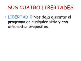 El documento describe las cuatro libertades del software libre: la libertad de usarlo para cualquier propósito, estudiar y modificar el código fuente, redistribuir copias, y distribuir versiones modificadas. El software libre otorga a los usuarios estas libertades de usar, copiar, modificar y distribuir software gratuitamente.