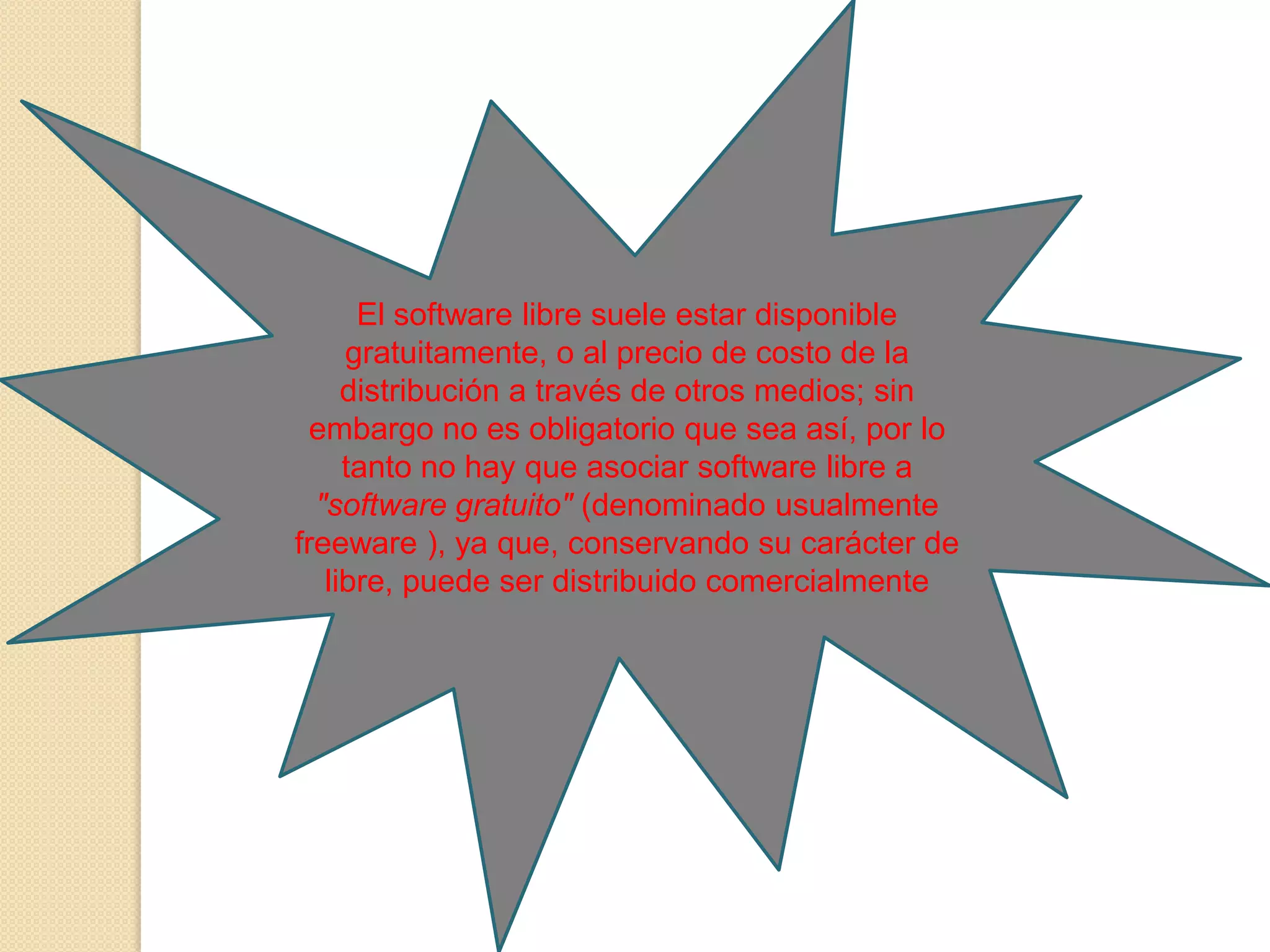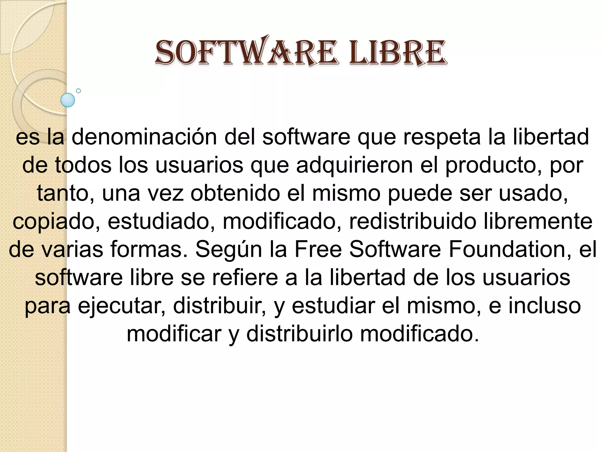 El documento define el software libre como software que respeta la libertad de los usuarios de usar, copiar, estudiar, modificar y redistribuir el software libremente. El software libre generalmente está disponible gratuitamente o a bajo costo, pero no necesariamente, y conserva su carácter de libertad incluso si es distribuido comercialmente. El software libre se distingue del software de dominio público, que no requiere licencia y pertenece a toda la humanidad, mientras que el software libre está sujeto a una licencia aunque otorgue amplias libertades a