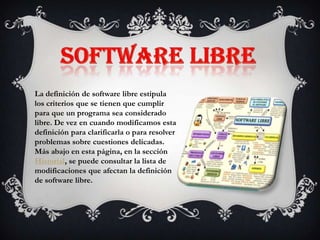 La definición de software libre establece los criterios que un programa debe cumplir para ser considerado libre, aunque ocasionalmente se modifica esta definición para clarificarla o resolver problemas. El software libre respeta la libertad de los usuarios al permitirles ejecutar, copiar, distribuir, estudiar, modificar y mejorar el software, tratándose de una cuestión de libertad y no de precio.