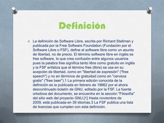 Este documento presenta una definición de software libre escrita por Richard Stallman y publicada por la Free Software Foundation. Define el software libre como un asunto de libertad y no de precio. Enfatiza que el término "free" se refiere a libertad y no a gratuidad. La definición se ha publicado en 39 idiomas.