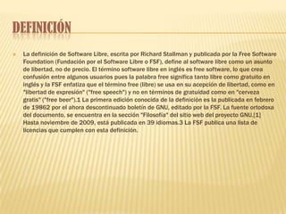El documento define el software libre como un asunto de libertad y no de precio, según Richard Stallman y la Free Software Foundation. El término "free software" en inglés puede crear confusión porque "free" significa tanto libre como gratuito. La definición de software libre se publicó por primera vez en 1986 y actualmente está disponible en 39 idiomas en el sitio web del proyecto GNU.