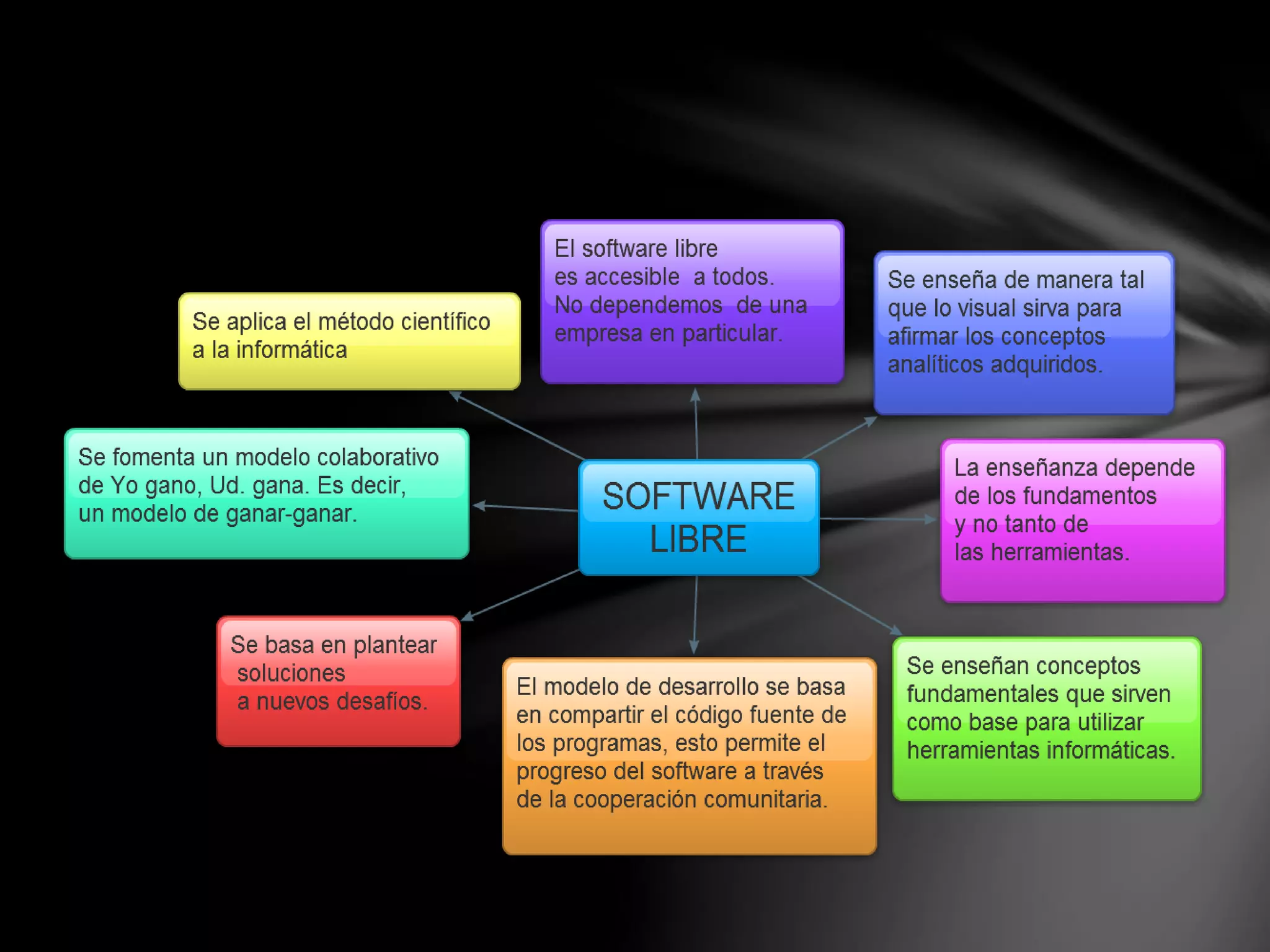 El documento define el software libre como aquel que le da a los usuarios la libertad de ejecutar, copiar, distribuir, estudiar, cambiar y mejorar el software. Esto incluye la libertad de usar el programa para cualquier propósito, estudiar y modificar el código fuente, distribuir copias para ayudar a otros, e implementar mejoras que beneficien a toda la comunidad. Para que un programa sea considerado software libre, los usuarios deben tener acceso al código fuente y la libertad de distribuir copias binarias y del código fuente sin restric