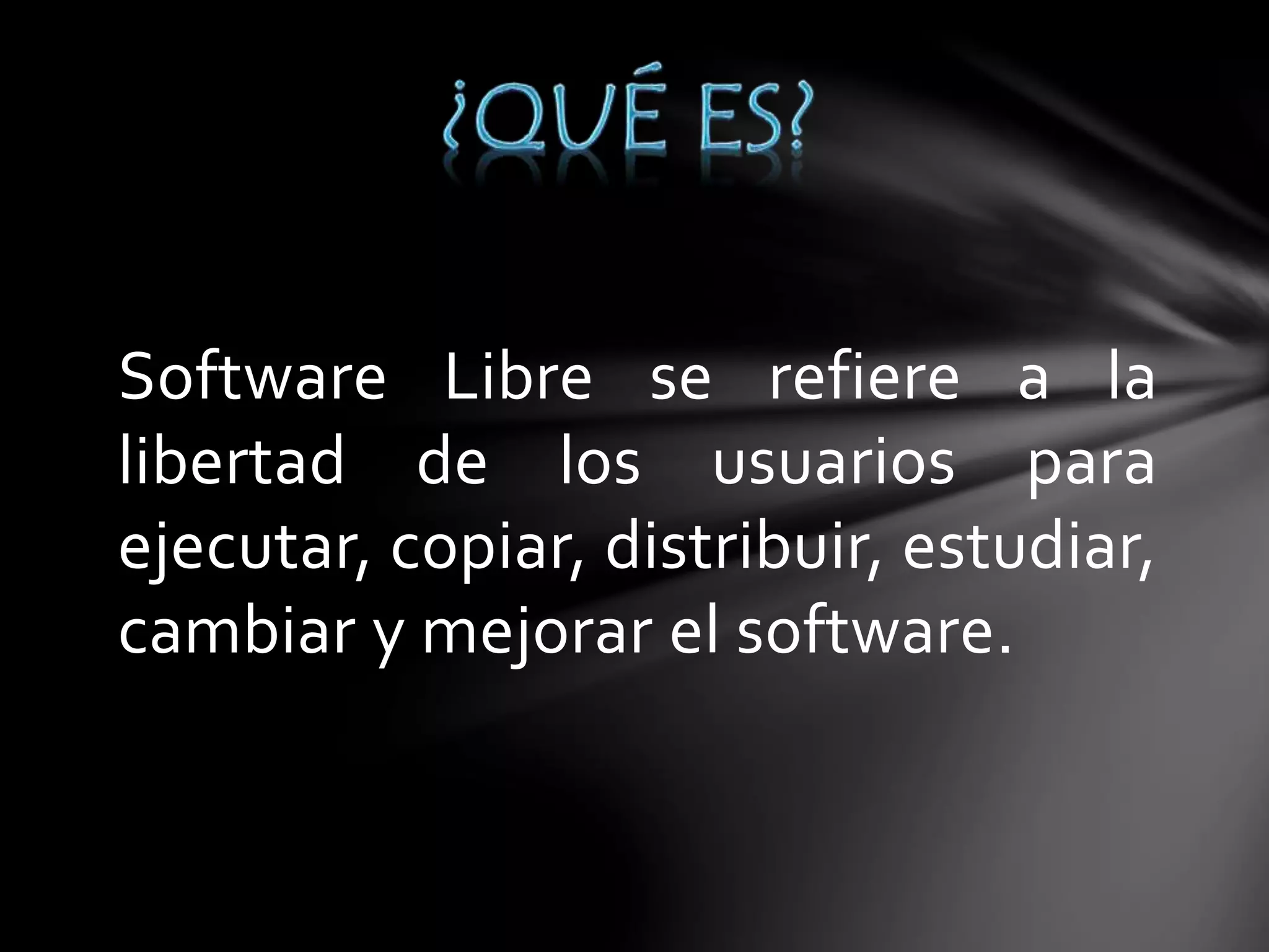 El documento define el software libre como aquel que le da a los usuarios la libertad de ejecutar, copiar, distribuir, estudiar, cambiar y mejorar el software. Específicamente, esto implica la libertad de usar el programa para cualquier propósito, estudiar y modificar el código fuente, distribuir copias para ayudar a otros, y mejorar el programa y compartir esas mejoras. Para que el software sea considerado libre, los usuarios deben tener acceso al código fuente y la libertad de distribuir copias binarias y de fuente sin restriccion