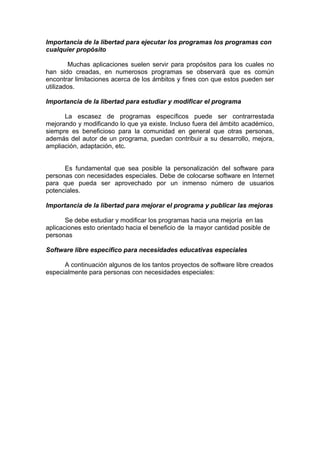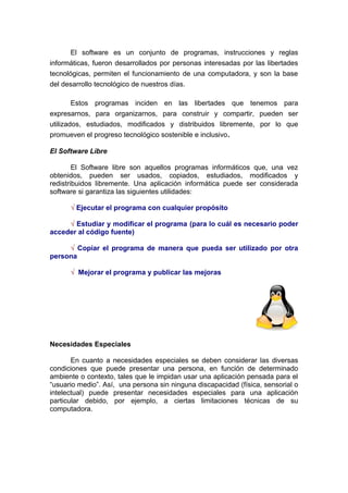 El documento describe el software libre y su importancia para promover la libertad, la inclusión y el progreso tecnológico. El software libre son programas que pueden ser usados, copiados, modificados y redistribuidos libremente. Esto es importante para satisfacer las necesidades especiales de todos los usuarios y permitir que la comunidad contribuya a mejorar el software. El documento también menciona algunos ejemplos de software libre diseñado específicamente para satisfacer las necesidades de personas con discapacidades.
