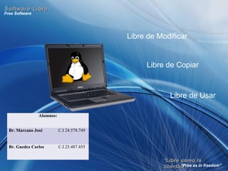 Este documento describe el software libre, su historia, definición y libertades. Explica que el software libre garantiza la libertad de usar, estudiar, distribuir y modificar el software. También resume las ventajas del software libre y algunos ejemplos importantes como GNU/Linux y OpenOffice. Finalmente, resume brevemente la aplicación del software libre en la administración pública venezolana.
