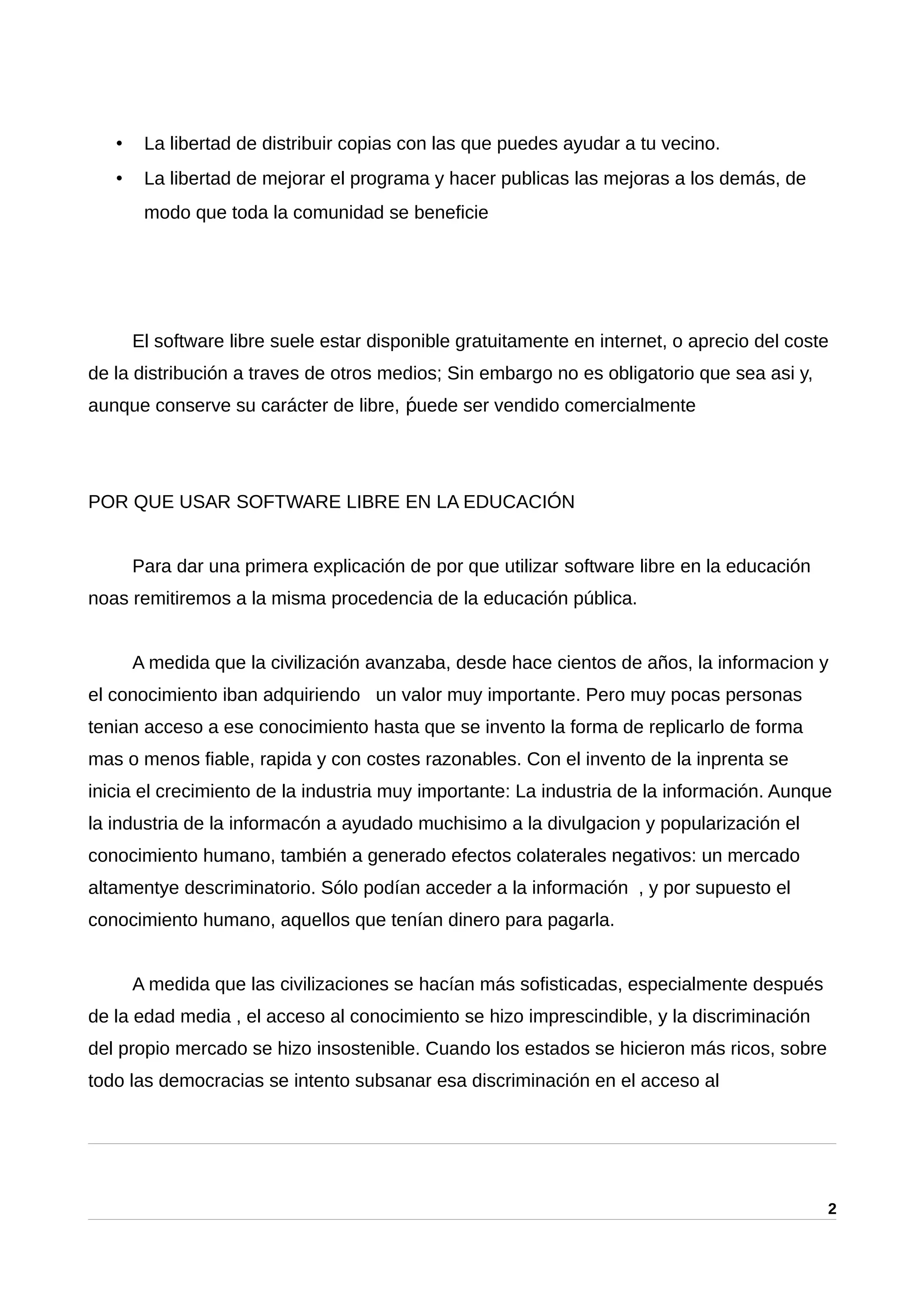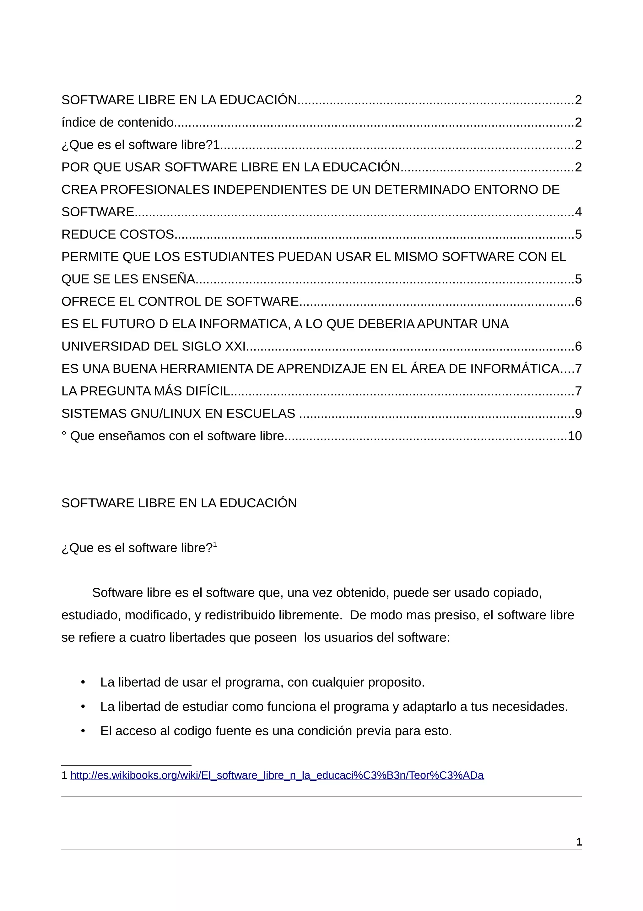 El documento describe los beneficios del uso de software libre en la educación. Algunos de los principales beneficios mencionados son que crea profesionales independientes de un entorno de software en particular, reduce costos, permite a los estudiantes usar el mismo software que se les enseña, ofrece control sobre el software, y es una buena herramienta para el aprendizaje de informática. También argumenta que el software libre es el futuro de la informática y debería ser adoptado por las universidades del siglo XXI.
