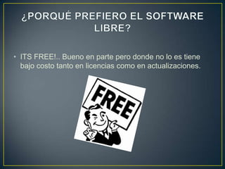 El documento habla sobre las ventajas de un software en particular. Ofrece la licencia gratuita o de bajo costo, permite al usuario tener todo el control sobre modificaciones y cambios, y genera confianza porque se conoce su origen.