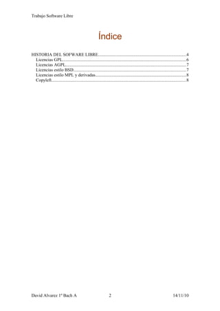 Este documento trata sobre el software libre. Explica que el software libre permite a los usuarios ejecutar, copiar, distribuir, estudiar, modificar y redistribuir el software libremente. Luego describe brevemente la historia del software libre y algunos tipos comunes de licencias como la GPL, AGPL y BSD. Finalmente, discute las motivaciones y significancia del software libre, incluidas las ventajas técnicas y económicas así como la ética de que el software es conocimiento que debe poder difundirse libremente.