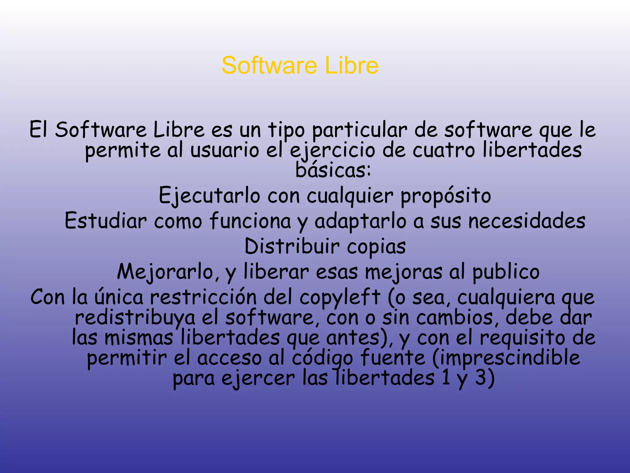 El documento proporciona información sobre software libre y propietario. Define software libre como aquel que permite cuatro libertades clave: ejecutarlo para cualquier propósito, estudiar su código, distribuir copias y mejorarlo. Menciona ventajas como escrutinio público y continuidad, e inconvenientes como dificultades de intercambio de archivos. También define software propietario, cuyo uso está restringido, y discute ventajas como control de calidad y desventajas como falta de transparencia y abandono.