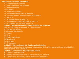El documento trata sobre la aplicación del software libre en educación, abarcando conceptos generales de Internet, herramientas de comunicación y colaboración, y generación de contenido visual. Destaca cómo las tecnologías de la información y comunicación (TIC) están transformando la educación, facilitando la comunicación y el trabajo colaborativo entre estudiantes y profesores. Además, se enfatiza la importancia de proporcionar contenido relevante y actualizado en la web para mejorar el proceso de enseñanza-aprendizaje.