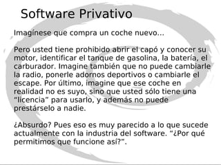 El documento explica la diferencia entre software libre y software de código abierto, subrayando que el software libre es un movimiento social que defiende las libertades del usuario, mientras que el código abierto se centra en la metodología de desarrollo. Ambos enfoques permiten la modificación y redistribución del software, pero el software libre impone condiciones más estrictas sobre la redistribución de modificaciones. En resumen, todo software libre es de código abierto, pero no todo código abierto es libre, y la elección entre ambos a menudo se basa en consideraciones filosóficas y prácticas.