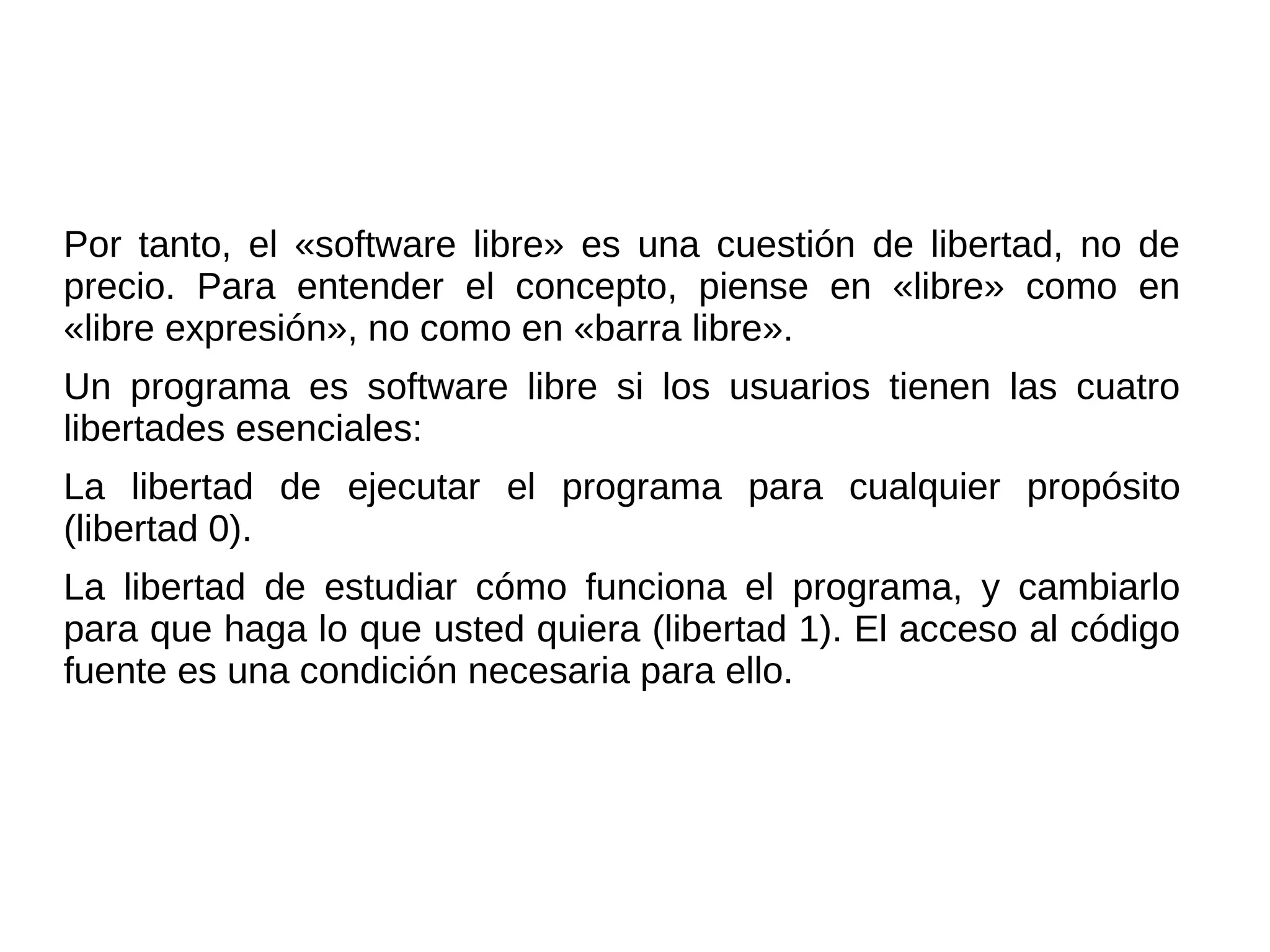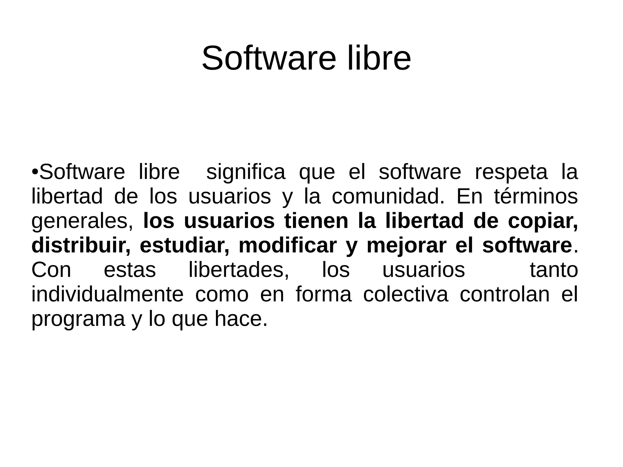 El documento define el software libre como aquel que respeta la libertad de los usuarios de copiar, distribuir, estudiar, modificar y mejorar el software, dándoles control tanto individual como colectivo sobre el programa. Para ser considerado software libre, un programa debe otorgar a los usuarios las cuatro libertades esenciales: ejecutar el programa para cualquier propósito, estudiar y modificar su código fuente, redistribuir copias, y distribuir versiones modificadas.