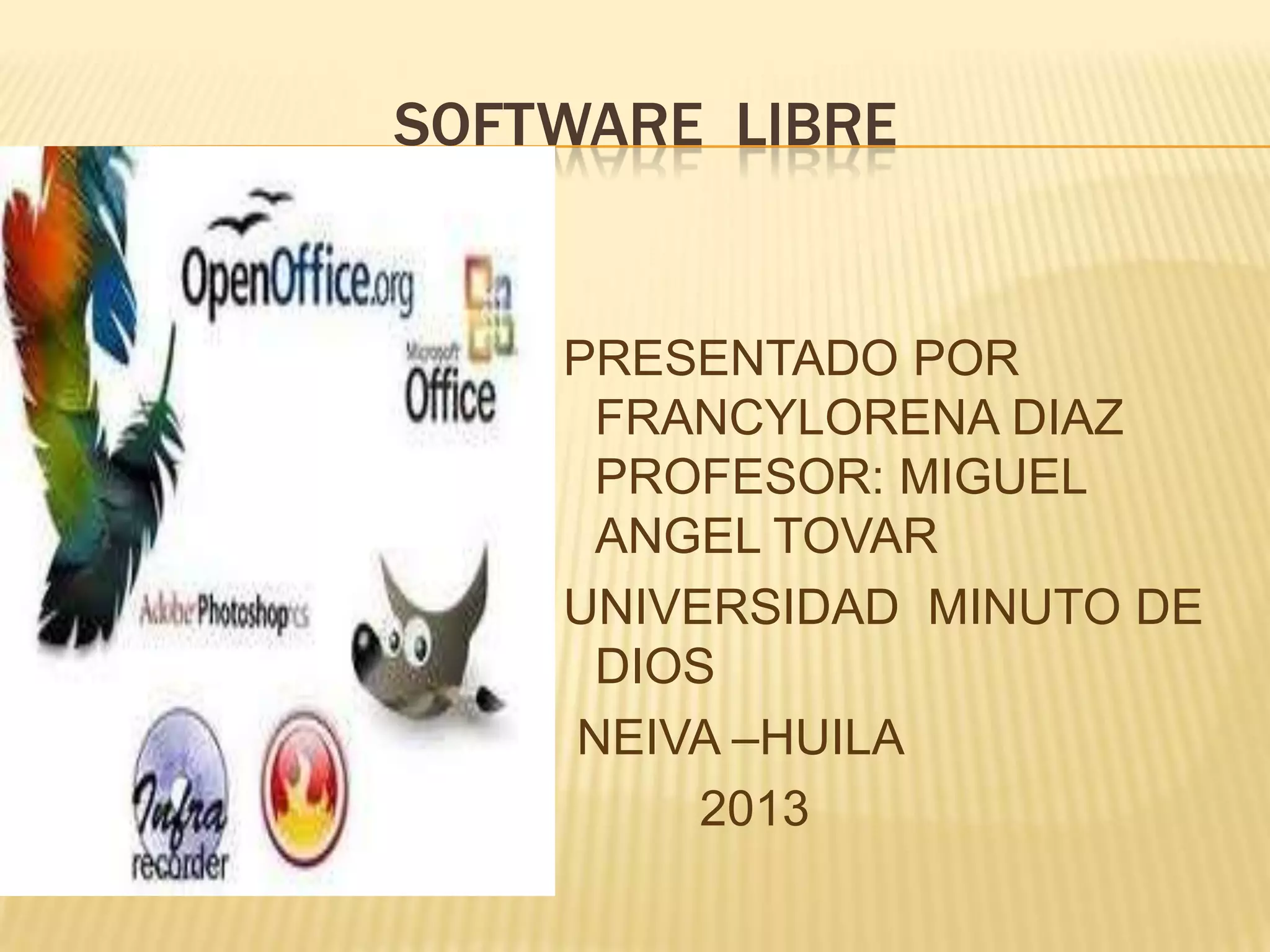El documento presenta el concepto de software libre y las cuatro libertades que este implica: la libertad de ejecutar el software con cualquier propósito, estudiar y modificar el código fuente, distribuir copias del software, y publicar mejoras realizadas al código para que toda la comunidad se beneficie. El software se considera libre cuando los usuarios gozan de estas cuatro libertades sin necesidad de pedir permisos o pagar por ellos.
