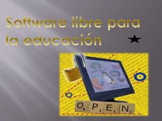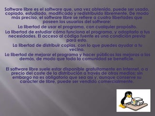 El software libre se refiere a software que puede ser usado, copiado, modificado y redistribuido libremente. Los usuarios tienen cuatro libertades: usar el programa para cualquier propósito, estudiar y modificar el código fuente, distribuir copias para ayudar a otros, e implementar y compartir mejoras para beneficiar a toda la comunidad. Aunque el software libre a menudo está disponible gratis, también puede ser vendido comercialmente manteniendo su carácter de libre.