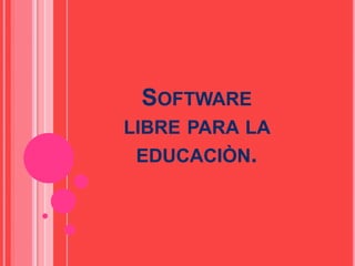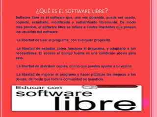 Este documento describe el software libre y los beneficios de usarlo en la educación. Explica que el software libre permite usar, copiar, modificar y redistribuir el software. Luego detalla seis ventajas del uso de software libre en la educación: 1) crea profesionales independientes, 2) reduce costos, 3) permite que los estudiantes usen el mismo software que en clases, 4) ofrece control sobre el software, 5) es el futuro de la informática, y 6) es una buena herramienta de aprendizaje.