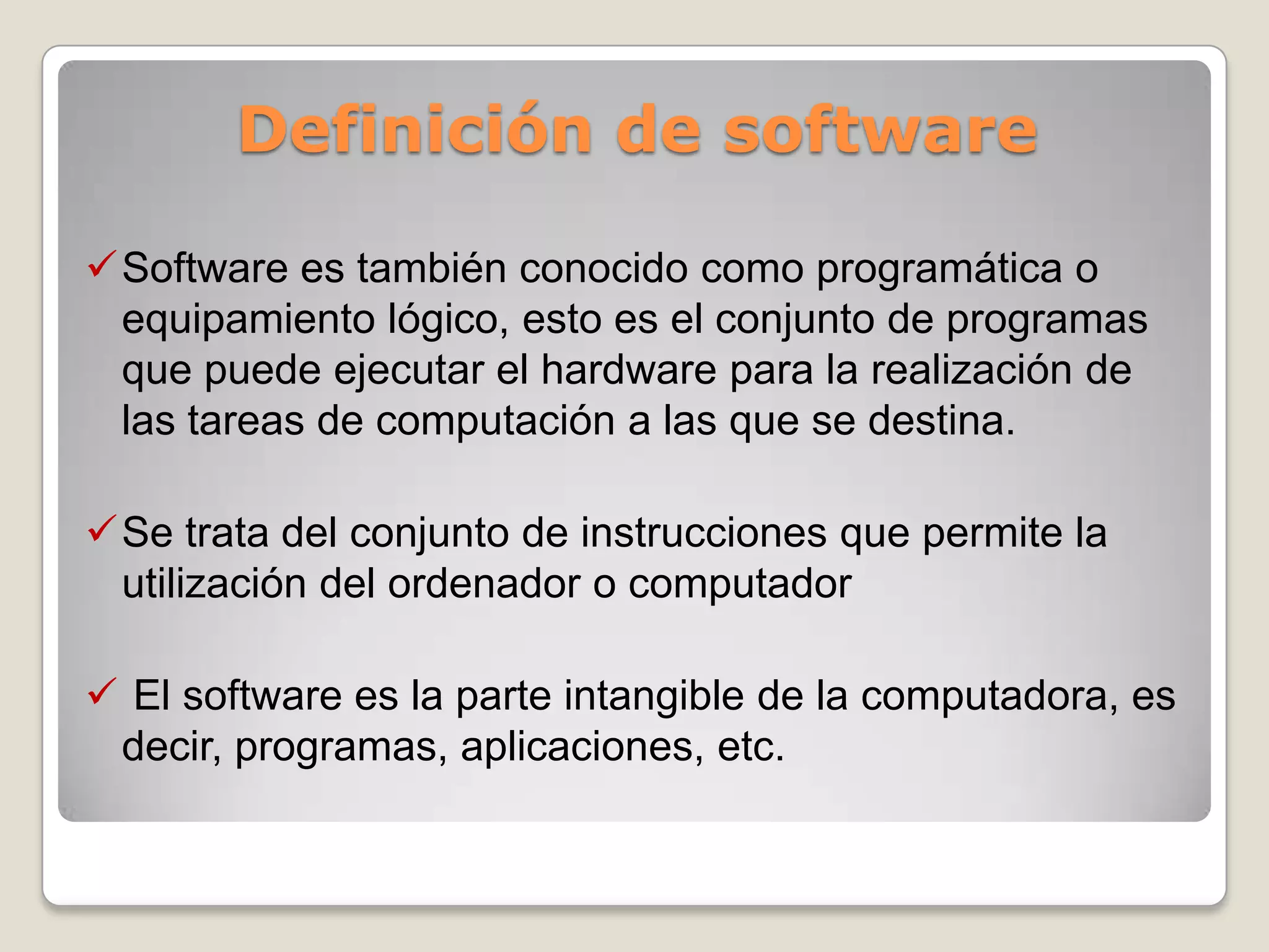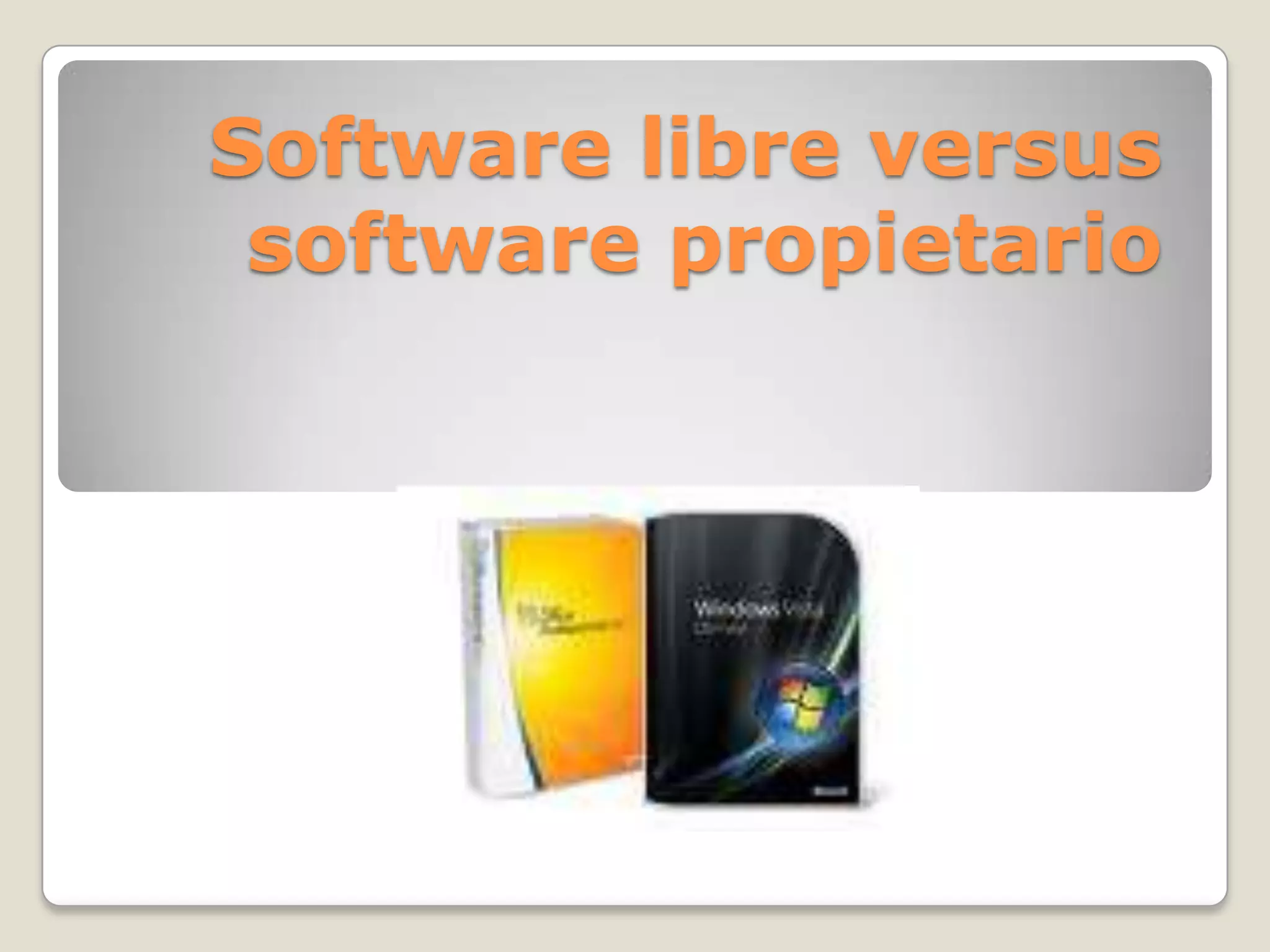 El documento compara el software libre y el software propietario. Define el software libre como aquel cuyo código fuente está disponible y permite la modificación, distribución y copia del software. El software propietario limita estas libertades y mantiene el código fuente en privado. También discute las ventajas e inconvenientes de ambos tipos de software.